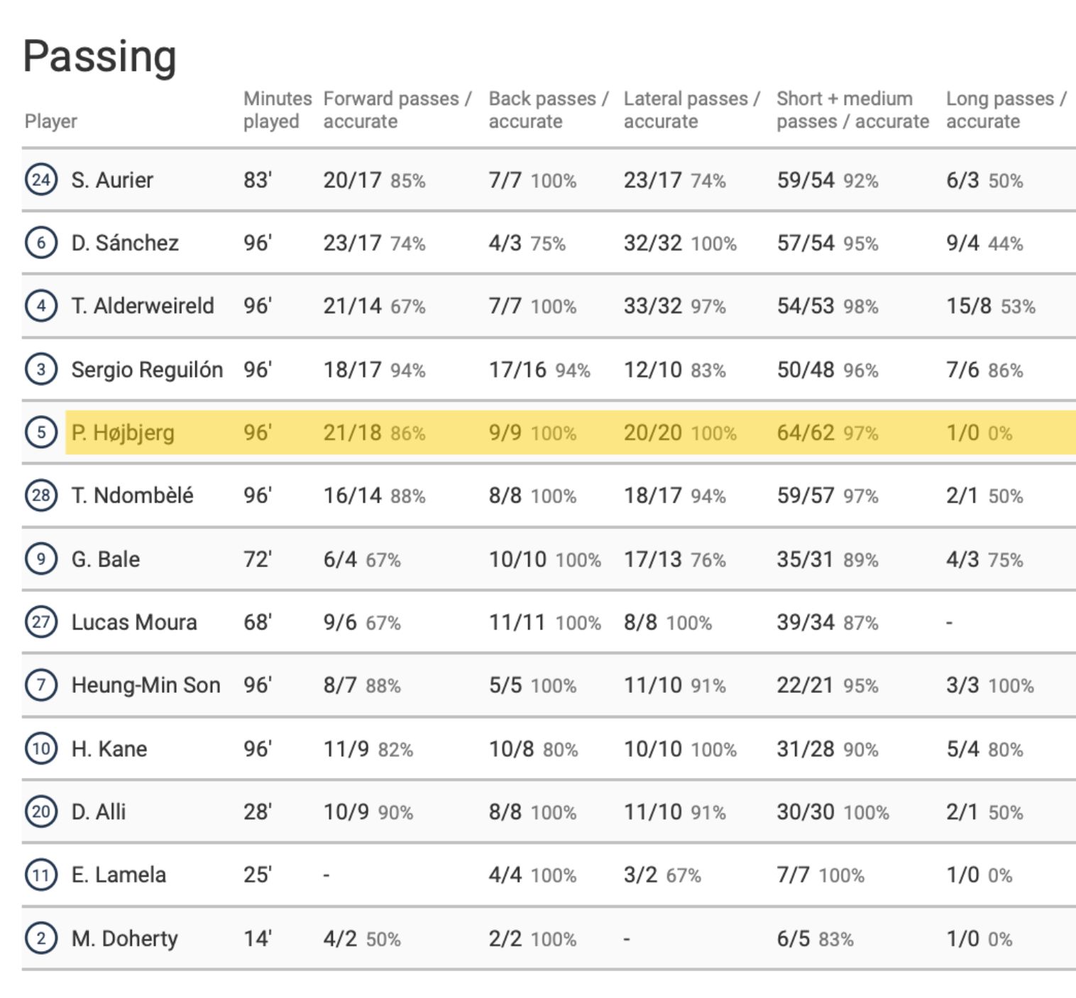 Hojbjerg is on the money always gives 100% with no panic. The players who panicky when they come under pressure Dier Winks Sanchez Sissoko I can add Ben, Aurier is another level he loses his mind altogether and he has no middle ground him is either he plays good or causes a penalty and red card which is another extreme it is my opinion and I can be wrong.
