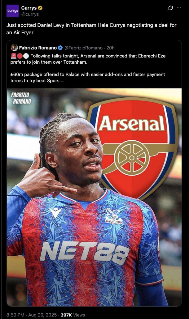 That failure was so funny, the electrical retailer Currys couldn’t resist taking the mickey out of the Tottenham chairman, Daniel Levy, in this sickeningly well-timed social media post on the X platform.