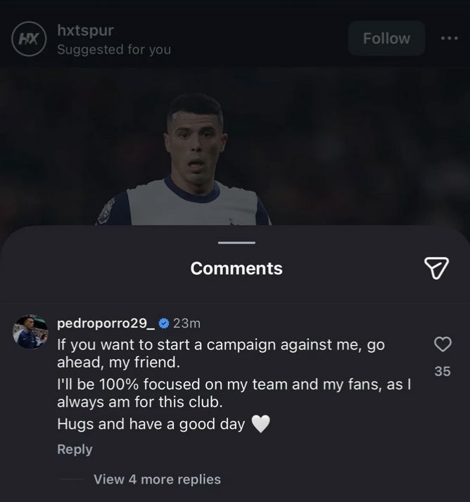 This message was seen by many as a direct response to the booing (labelling those fans as not “true” supporters), sparking backlash from some Tottenham fans who felt the players should focus on their poor performances instead of criticising supporters. Manager Thomas Frank later defended the sentiment behind Porro’s post.