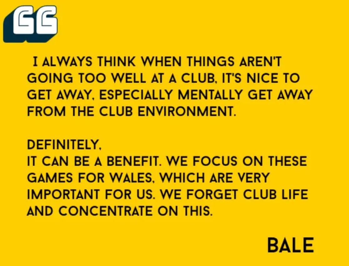 I keep rereading Bale’s words and am still struggling to identify what there is about “I always think when things aren’t going too well at a club, It’s nice to get away, especially mentally get away from the club environment. Definitely.”