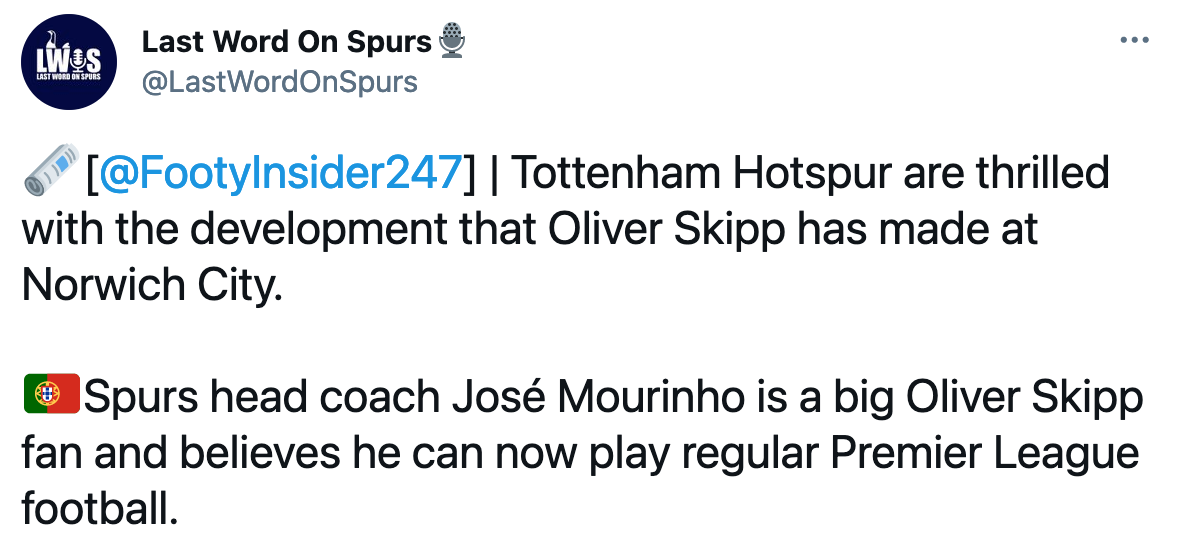 Oliver Skipp has undoubtedly won the hearts and minds of most Tottenham fans with his solid displays for Championship topping Norwich City. Barely even a fringe player at Spurs, Skipp has been allowed to come out his shell at Carrow Road and judging by the comments online from Canaries fans after games, become a much valued player. One account shared the show reel, but the mood in the Spurs camp is so low, that most respondents were inclined to tell the boy to steer clear of a return to London.
