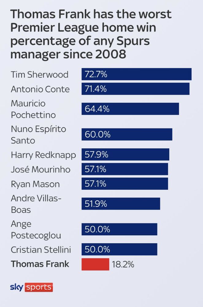 “Thomas Frank losing internal support at Tottenham as the club considers calling time on his seven-month reign. At least one club executive has actively recommended his dismissal.”