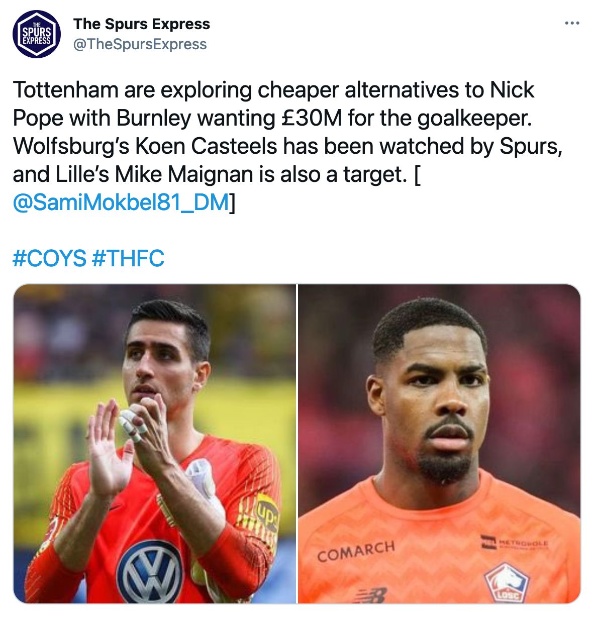 Sami Mokbel believes that Wolfsberg’s Koen Casteels and Lille’s Mike Maignan could be alternative picks – should Hugo Lloris’ first choice replacement be deemed too expensive.