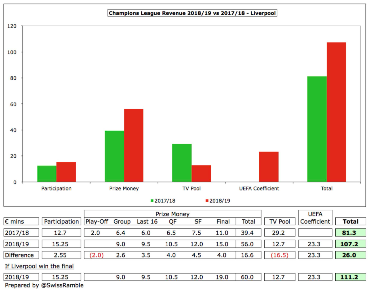 Liverpool’s Champions League revenue is €107m for reaching the final, up from €81m last season.