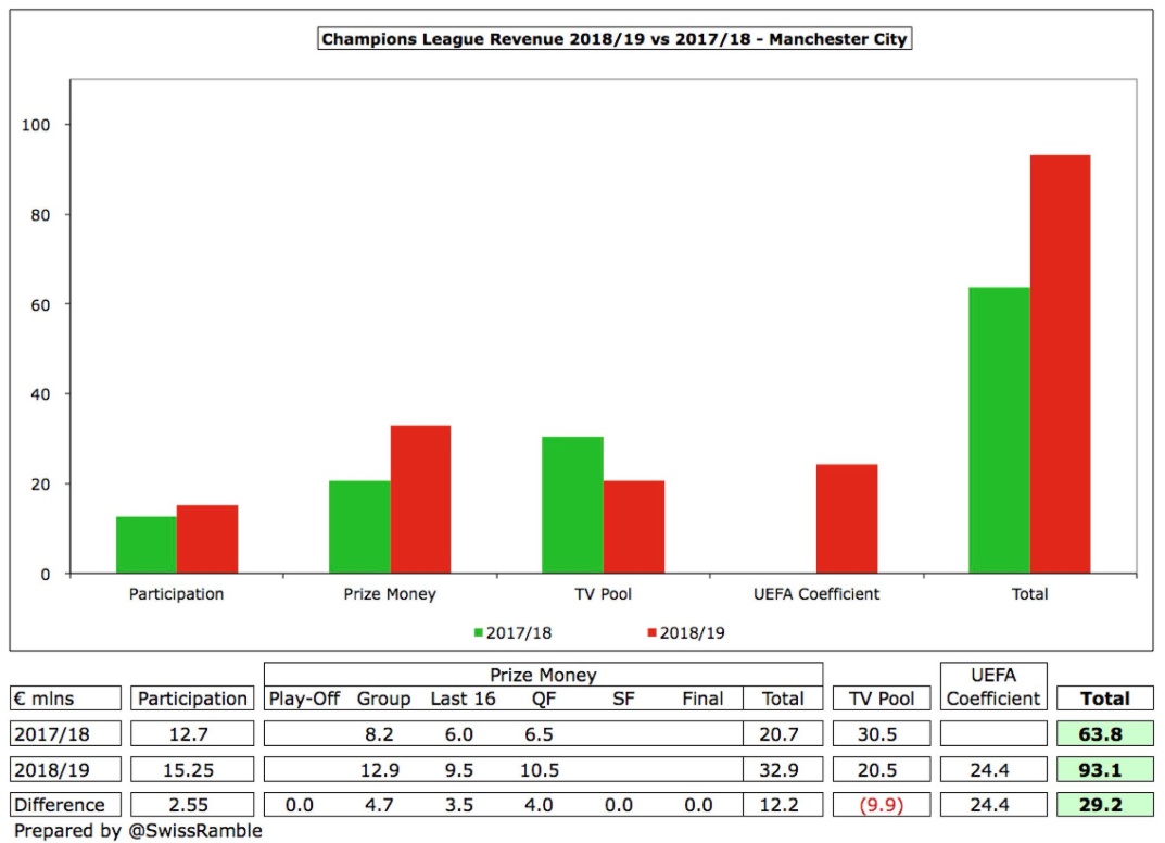 City’s Champions League revenue is €93m for reaching the quarter-finals, up from €64m last season.
