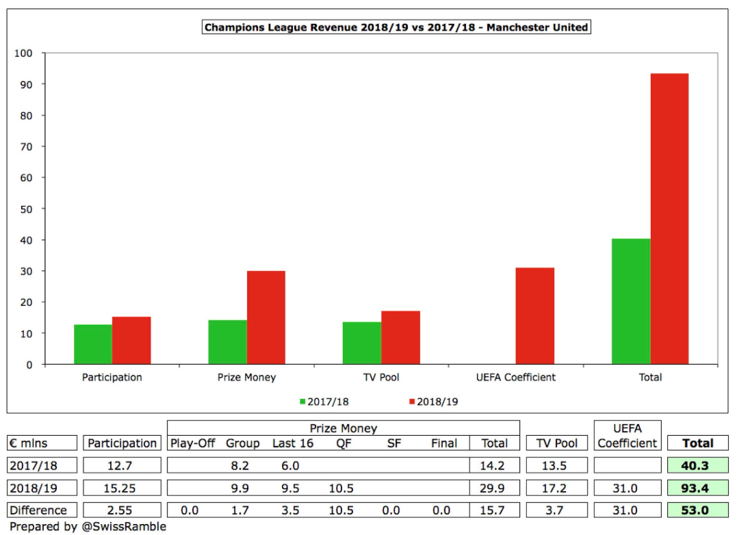 United’s Champions League revenue is €93m for reaching the quarter-finals, up from €40m last season.