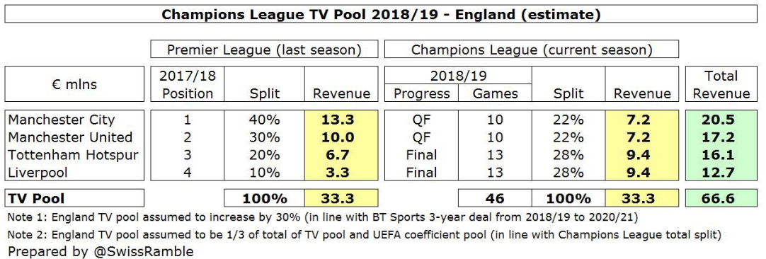 It might seem strange that the 2018/19 Champions League revenue for English clubs is relatively even, but this is because of the different elements, eg LFC and THFC have highest prize money, MUFC the highest UEFA coefficient and MCFC the highest TV pool.