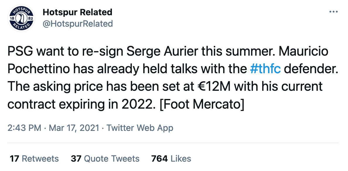 The real giveaway within the Foot Mercato piece is that Tottenham are supposedly looking for just €12million for Serge strikes me as perhaps a little under what one might expect from a keen negotiator such as Daniel Levy.