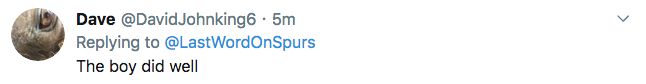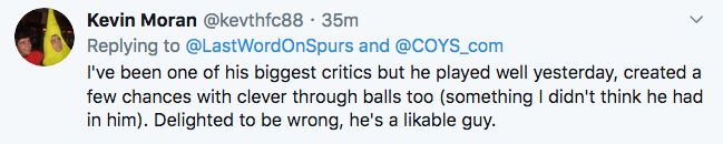 Some of his passes were well direct and creative. He set up Kane with a lovely pass first half. He reminded me of tintin looking for that key pass all the time. With his pace and dribbling and shooting and top attitude hes been good for us… Add tackling, intercepting, and key passes he is a dream… Like you say H his form has always been spluttery. If he can get consistency then we have a great player… We don’t need Willian with Lucas and Bergwjin fighting for that right wing.