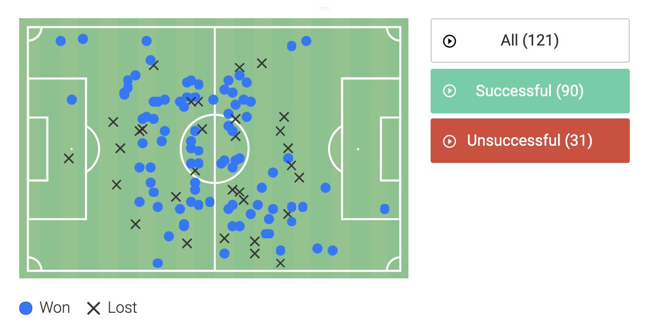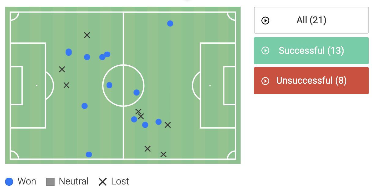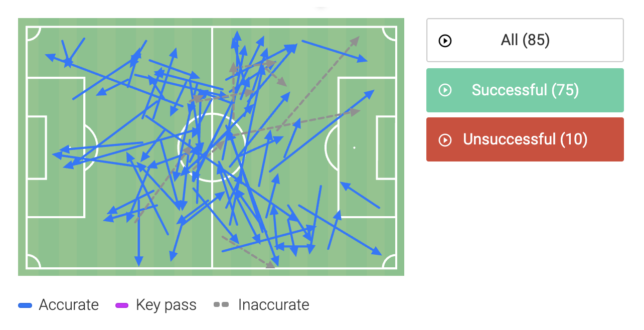Key indicators here would be the spread of activity on the heatmap, combined with the total successful actions score and the number of long passes (there we 8 attempted and 7 were successful).