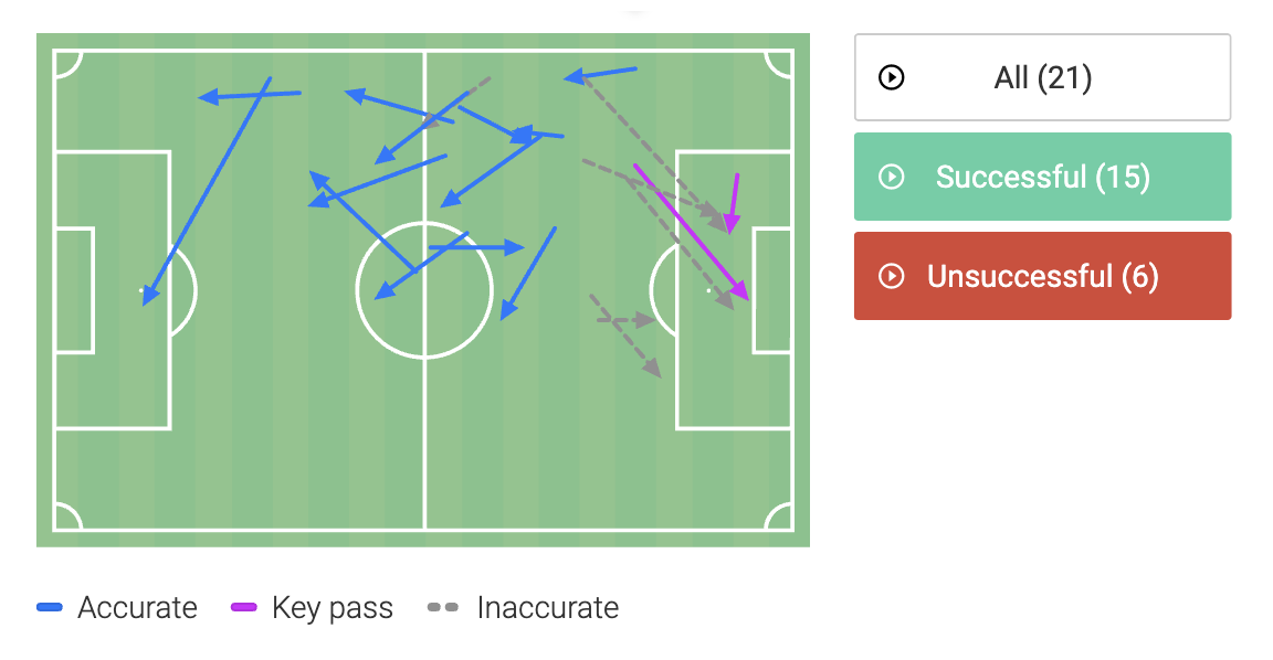 Sonny really struggled at Craven Cottage in the narrow maelstrom of it all. 49% is too low; toss a coin territory, which was atypical for the South Korean, whose mean average is 56.8%. Too many of those pesky black crosses.