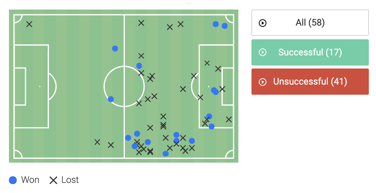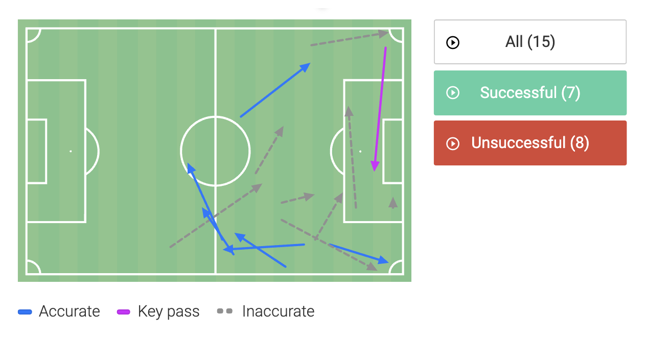 Achieving a total successful action percentage of 29% is woeful. Just 17 successful actions and a sea of black crosses aren’t acceptable at any level.
