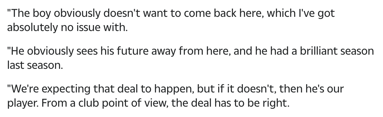 What bothers me the most is that Bremer isn’t signed yet. The lad is pure quality and on 18k per week. Looks like the Ruben Dias saga all over again.